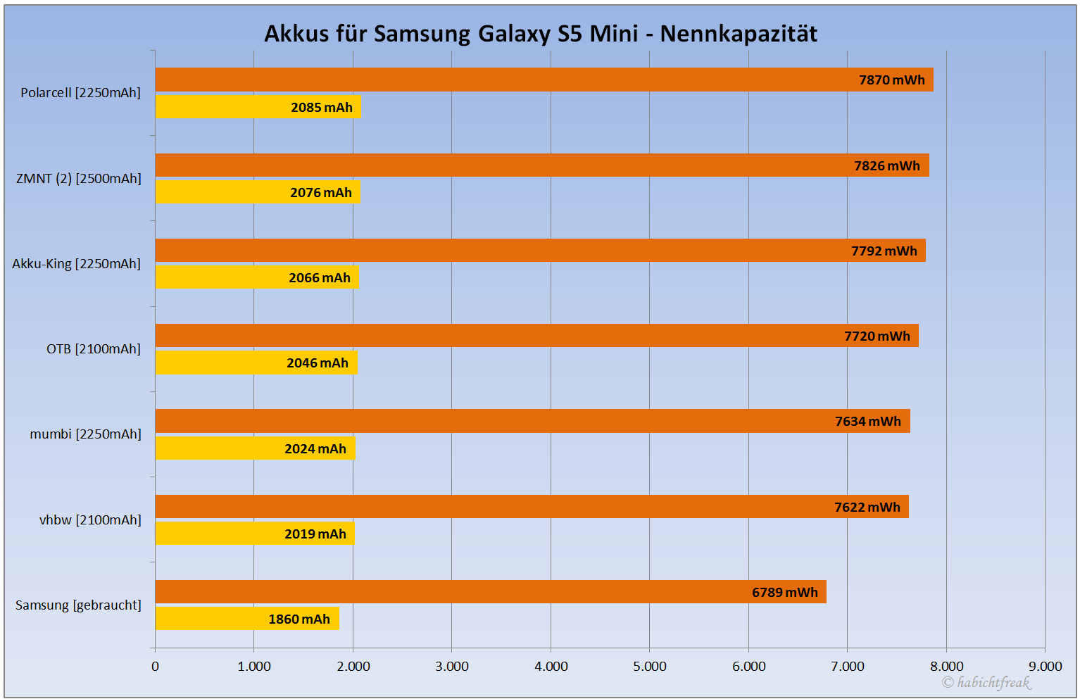 Ausgangswert für meine Betrachtungen ist der originale Samsung Akku. Dieser wird mit einer Nennkapazität von 2100mAh angegeben. Auch ein Samsung Akku hat nicht exakt 2100 mAh, sondern liegt irgendwo zwischen 95% und 100% des angegeben Wertes (2000-2100mAh). Interessanterweise liegen alle getesteten Akkus in genau diesem Bereich. Soweit die guten Nachrichten. Keiner der getesteten Akkus ist schlechter als das Original.
