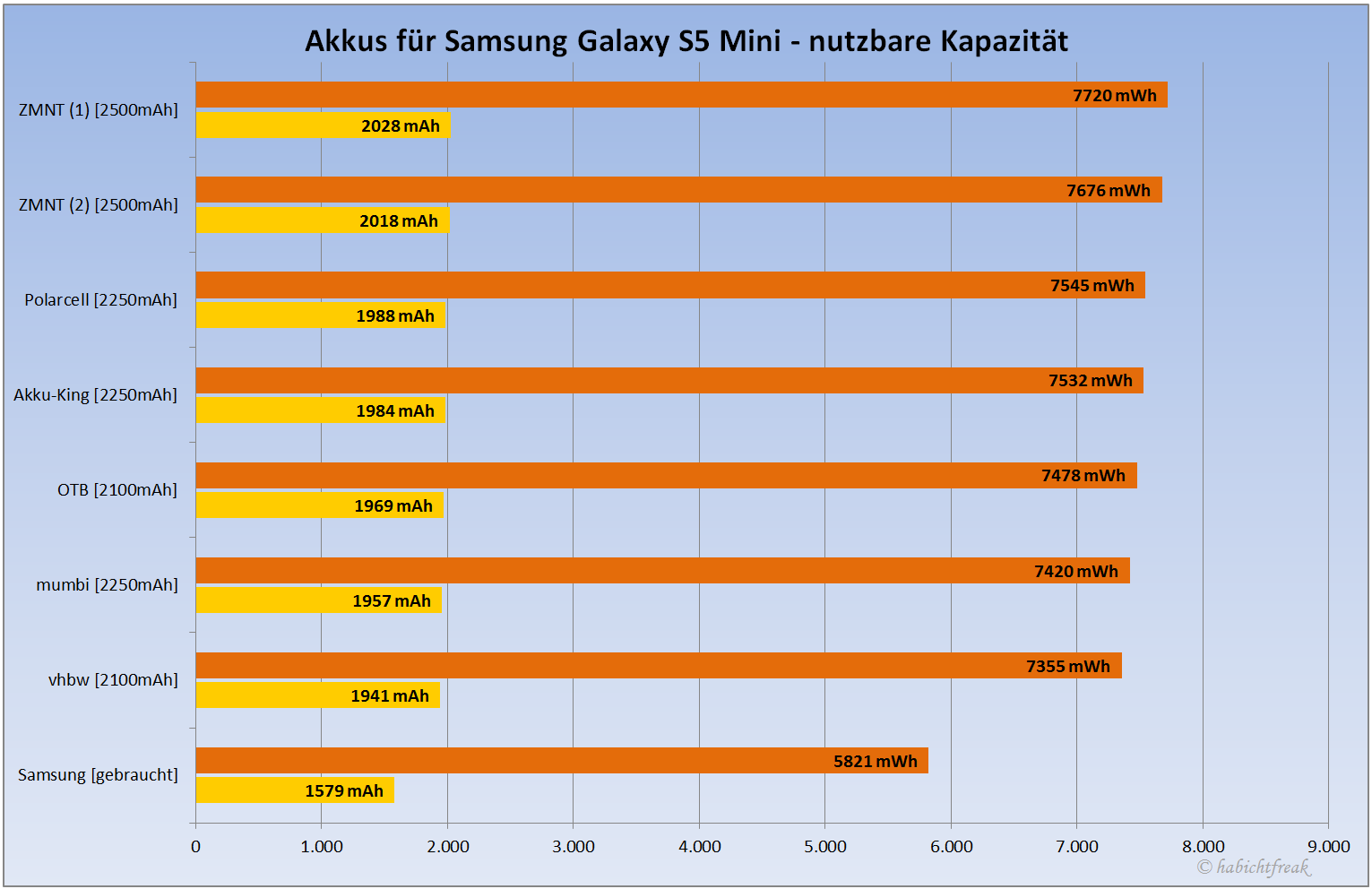Ich wollte maximale Akkulaufzeit die möglich ist, ich fand den 2500 mAh Akku von ZMNT und kaufte ihn. Die Enttäuschung war groß, wie weit dieser Akku von der angegebenen Nennkapazität entfernt ist. So entstand die Idee zu diesem Test, Akkus von verschiedenen Anbietern zu testen und zu schauen, wie viel mehr an Kapazität ist bei 2250er oder gar 2500er Akku tatsächlich vorhanden. Der originale Samsung Akku wird mit einer Nennkapazität von 2100 mAh angegeben.