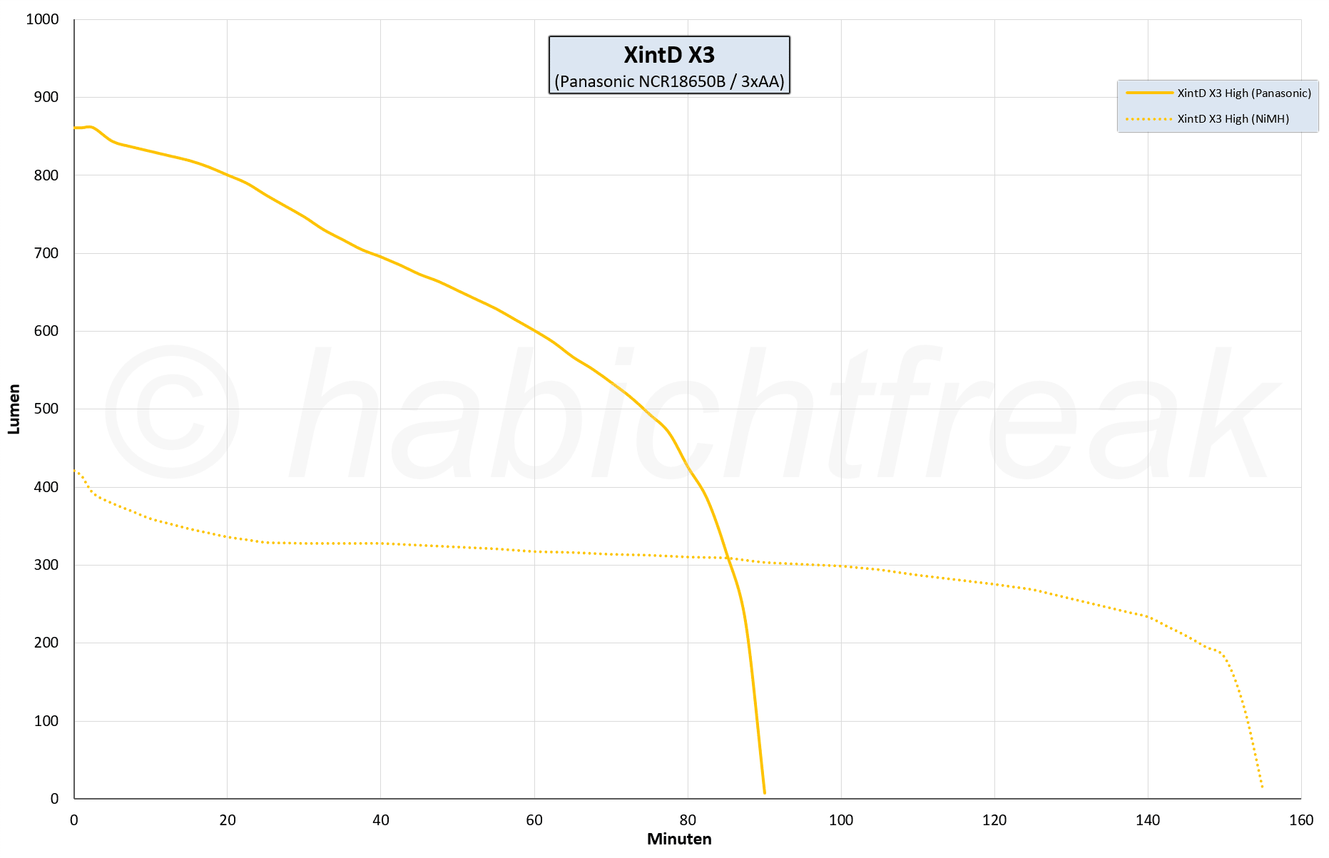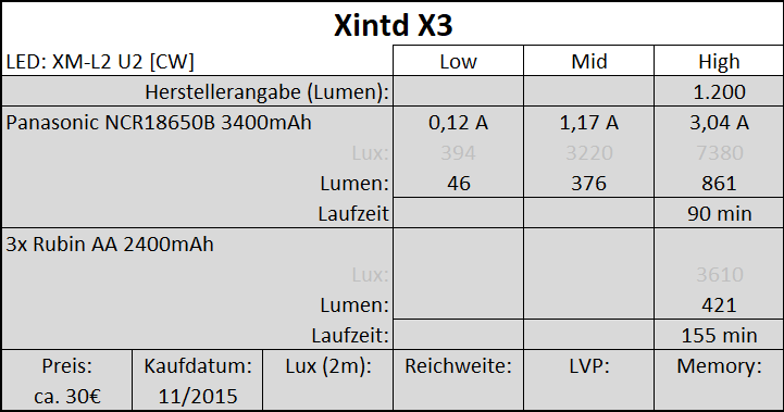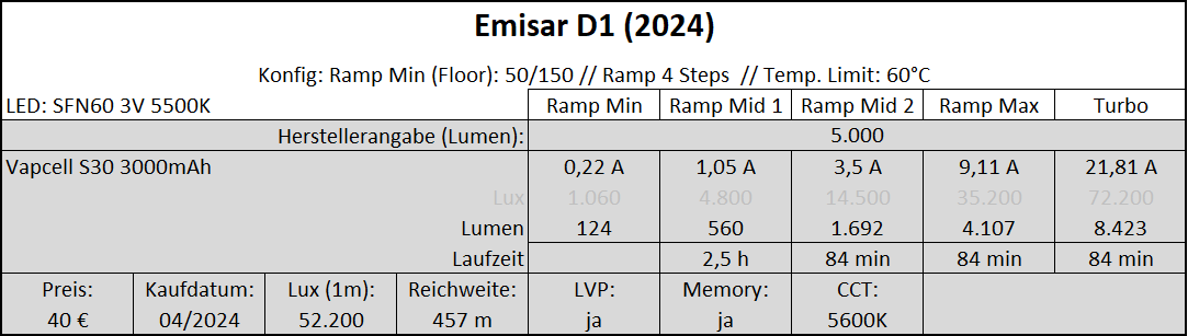 Die XintD hat stark gebündeltes Licht (Thrower), und zwar um ein Vielfaches gegenüber der Emisar D1. Dies ist aus reinen Luxmessungen aber nicht ersichtlich. Aus ihnen lässt sich nur die Reichweite berechnen wie weit die Lampe leuchtet. Laut ANSI ist die Reichweite die Strecke, an dessen Ende noch 0,5 Lumen ankommen. Ob dabei extrem viel Streulicht (Flood) entsteht, oder die 0,5 Lumen ein kleiner Punkt ist wie bei einem Laserpointer, darüber sagt der Wert rein gar nichts aus.
