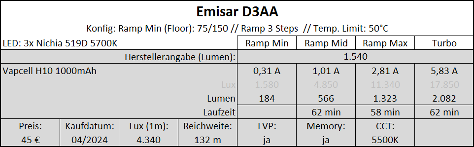 | Emisar D3AA (3x Nichia 519D 5700K) | ||