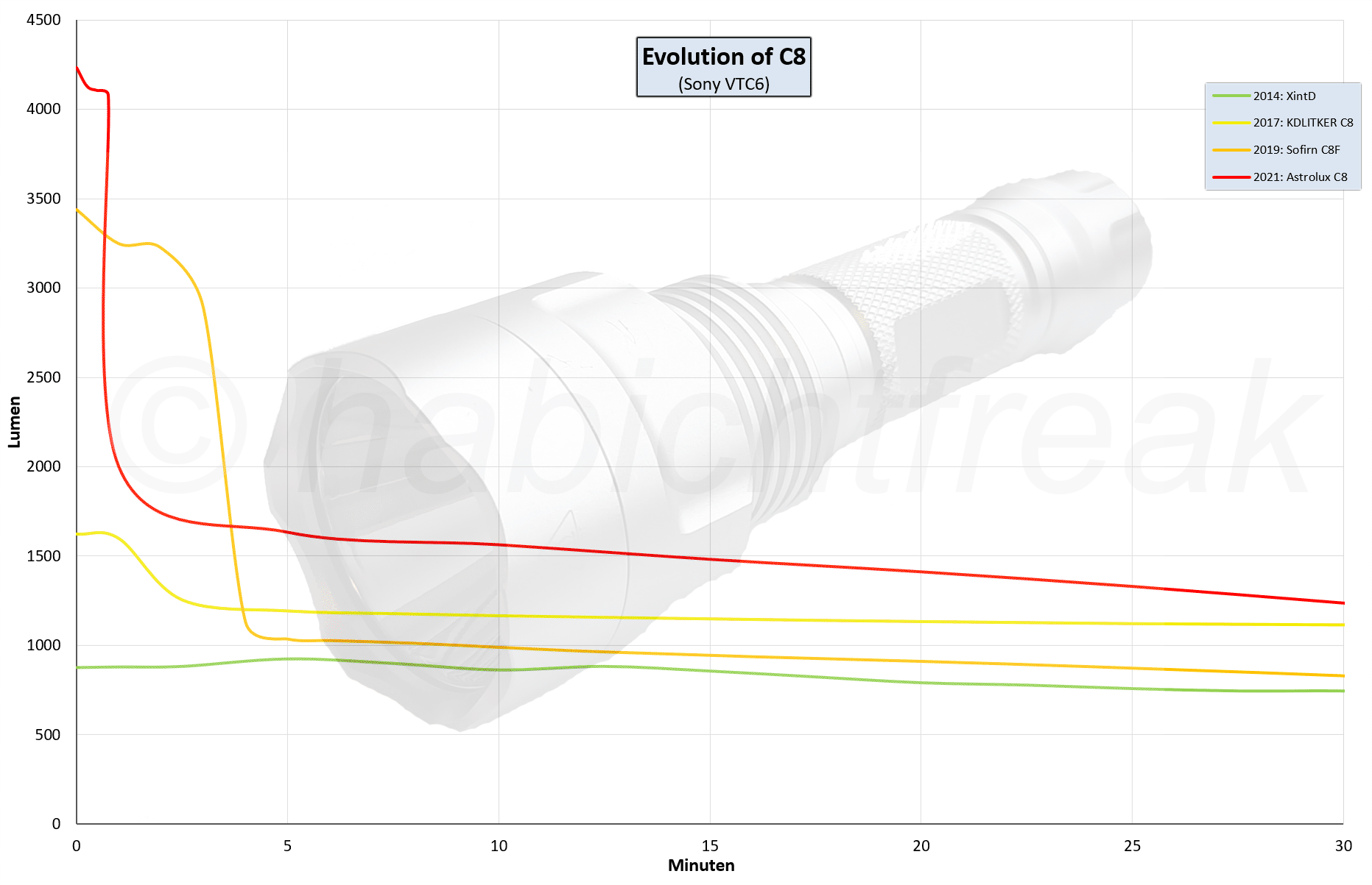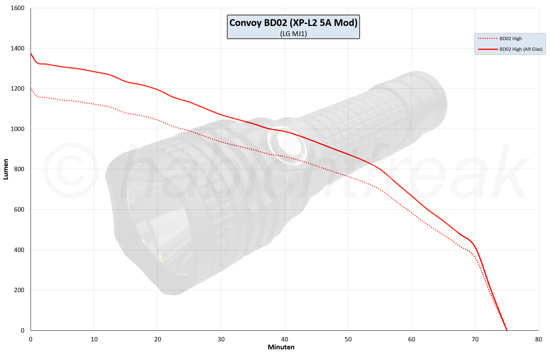 Ob eine Taschenlampe eher Flutlicht macht, also den Nahbereich sehr stark ausleuchtet, oder das Licht stark gebündelt wird (durch einen großen Reflektor, oder durch eine Optik) wird meist anhand der gemessenen Lux (typischerweise auf 1 oder 2 Meter Entfernung) beurteilt. Dieser Wert alleine sagt aber rein gar nichts aus. Denn eine Lampe wie die Emisar D1 (SFN60) hat etwas über 52.000 Lux auf einen Meter. Eine XintD C8 (XM-L2) hat etwa 33.000 Lux auf einen Meter. Welche Lampe hat nun Flutlicht und welche gebündeltes Licht?