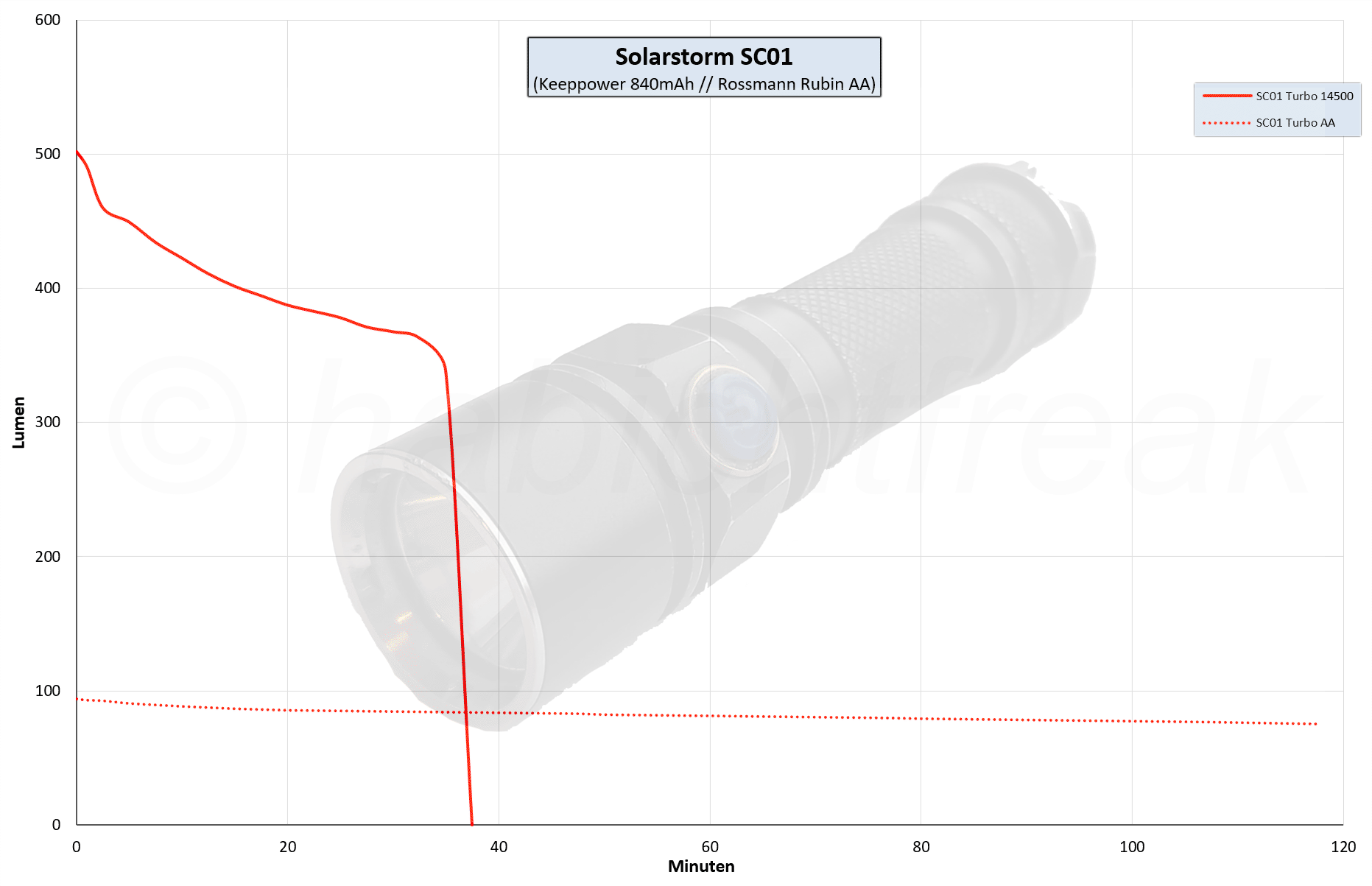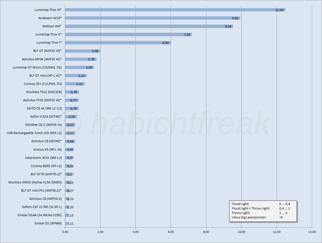 Aus diesem Grund halte ich es für sinnvoll, den Luxwert in Relation zu setzen zur gesamten Helligkeit (Lumen). Hierzu habe ich eine ganz simple Formel genommen, die einfach diese beiden Werte in Relation zueinander setzt. Und der Wert der dabei heraus kommt … nennen wir sie die habichtsfreak`sche Kennzahl ;)