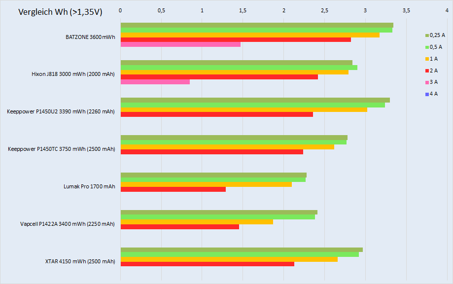XTAR, Vapcell, Keeppower oder Hixon. Alle sehen nur die Rücklichter der BATZONE Akkus. Natürlich hängt das auch mit teilweise sehr großen Phasen der Spannungsabsenkung zusammen. Aber niemand hat XTAR empfohlen die 1,1V Phase auf 30% aufzublähen. Da steckt eine Menge Energie in den XTAR die in typischen Anwendungsbeispielen (Motoren in Spielzeug, Taschenlampen, LED Beleuchtung) nicht nutzbar ist, da die gleichen Probleme wie mit NiMH Akkus auftreten. Hixon und BATZONE gehen mit ihren kleinen Phasen der Spannungsabsenkung meiner Meinung nach den richtigen Weg.