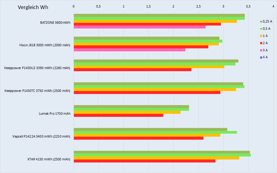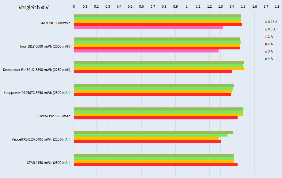 Mit einem Wort: Beeindruckend. Ich gestehe, ich habe von diesen Akkus nicht viel erwartet. Das die BATZONE Akkus allerdings Vapcell, XTAR und Keeppower hinter sich lassen, das ist wirklich beeindruckend. Bis zu 2250mAh bei 1,5V (1,1V Phase nicht mitgezählt), das hat noch kein Akku geschafft. Mit im Schnitt 3430mWh erreichen die Akkus die aufgedruckten 3600mWh nicht ganz, aber dazu gleich mehr. Die 1,1V Phasen sind erfreulich klein, so ist der Großteil der gespeicherten Energie auch bei 1,5V abrufbar. Die Spannungen über die gesamte Laufzeit sind bis hinauf zu 2A auch sehr nah an 1,5V. Insbesondere von 2A zeigen sich die BATZONE Akkus gänzlich unbeeindruckt, während die Akkus von XTAR, Vapcell, Hixon und Hornbach zu kämpfen haben überhaupt in der Nähe von 1,5V zu bleiben.