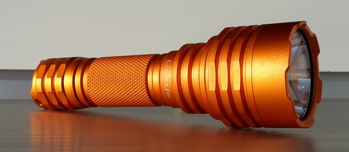 Mit der Convoy C8+ geht es ausnahmsweise einmal nicht um die Jagd nach mehr Lumen, sondern nach mehr Reichweite. Viel mehr Reichweite, um genau zu sein. Entgegen meiner sonst sehr konservativen Einstellung, habe ich das Modell in der Farbe orange bestellt. Gemeint ist hier die Farbe des Gehäuses, nicht des ausgestrahltem Lichtes. Diesbezüglich bin ich klassisch geblieben, bei weiß. Es gibt auch Modelle mit blauem und grünem Licht.