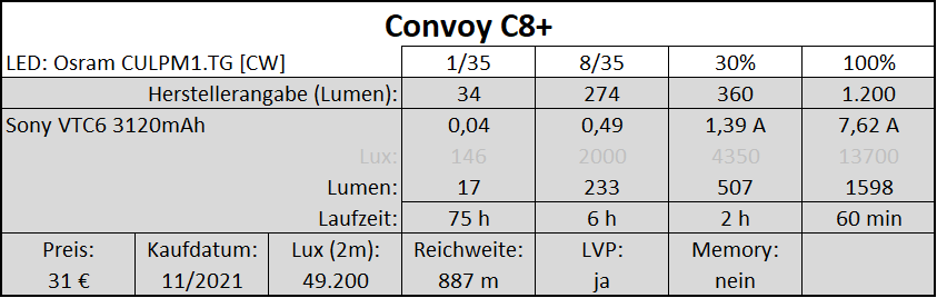 Die Convoy C8+ kommt „nur“ auf 1,11. Klingt eher nach Flooder, aber das ist sie auch. Denn das Verhältnis aus Lumen und Reichweite ist z.B. bei einer Acebeam W10 etwa 9 Mal höher. Dennoch wird die C8+ als throwerlastig bezeichnet. Das liegt einfach daran, dass die meisten Lampen einen Wert unter 1 haben und nur sehr wenige über 1 liegen. Werte nahe 10 werden nur von LEP-Lampen erreicht. Gemessen an der kleinen Bauform, ohne riesigen Reflektor ist die Lampe durchaus als throwerlastig zu bezeichnen.