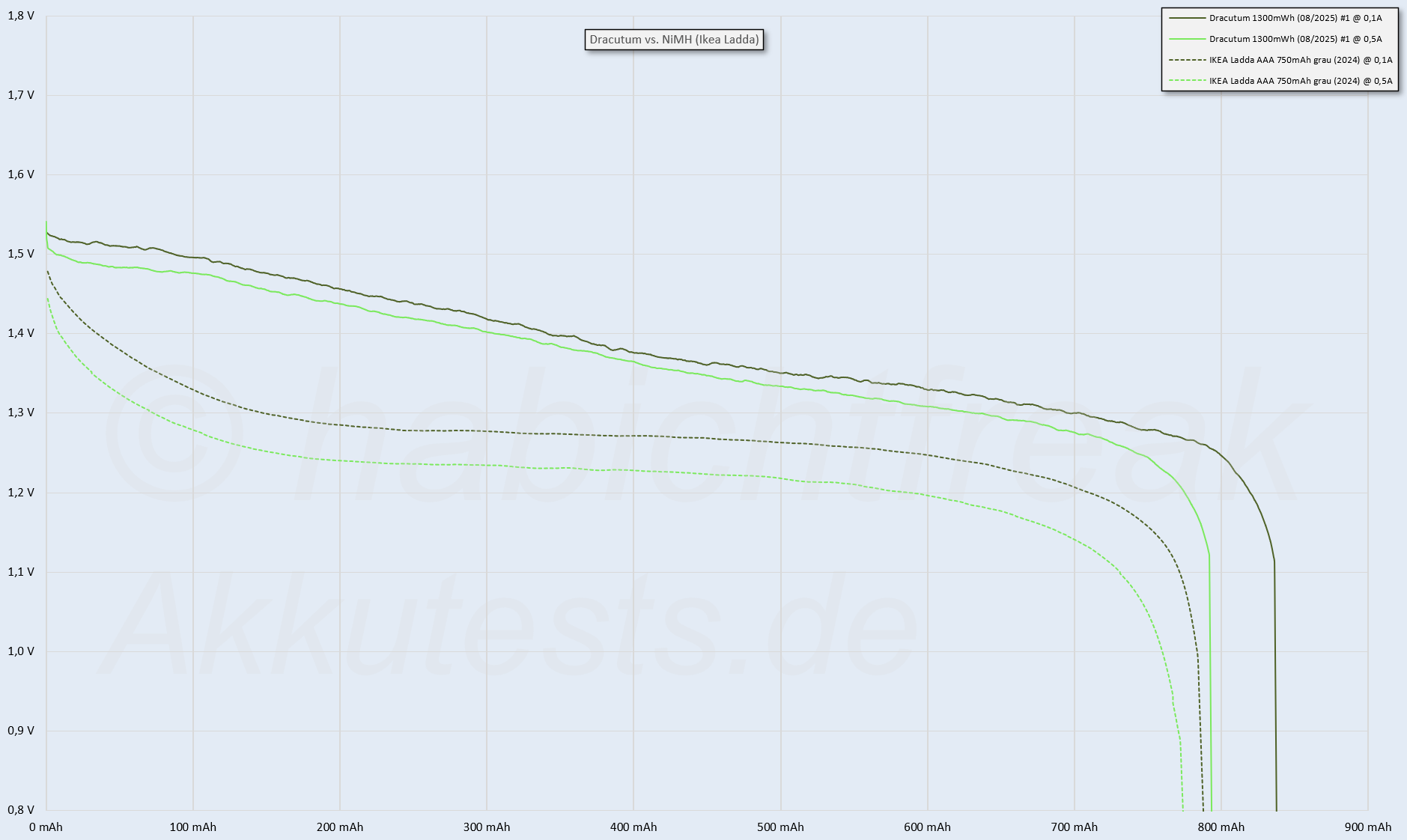 Ein direkter Vergleich zu anderen 1,5V Akkus, die tatsächlich konstante 1,5V liefern ist hier schwierig. Denn durch die geringere Spannung, erreichen die Dracutum Akkus potenziell mehr mAh. Auch die aufgedruckten Werte (780mAh) werden übertroffen, da auch die von einem imuto Akku kopiert wurden, der aber 95% seiner Laufzeit 1,5V liefert. Die Dracutum Akku erreichen mit bis zu 830 mAh zwar mehr Kapazität als angegeben, das ist bei der Spannungslage aber nicht verwunderlich. Die angegebene entnehmbare Energie (1170mWh) wird mit bis zu 1150mWh nahezu erreicht.