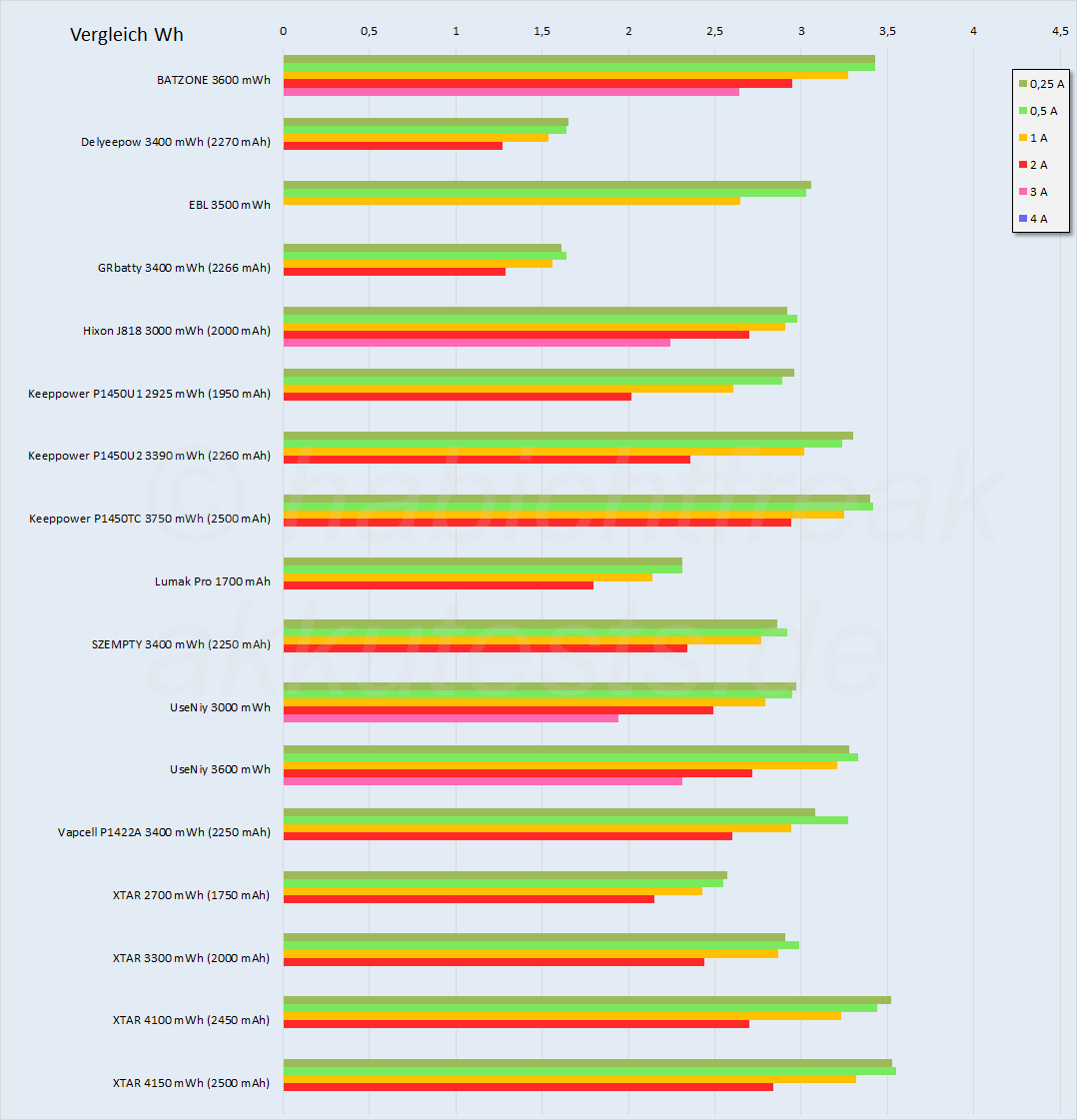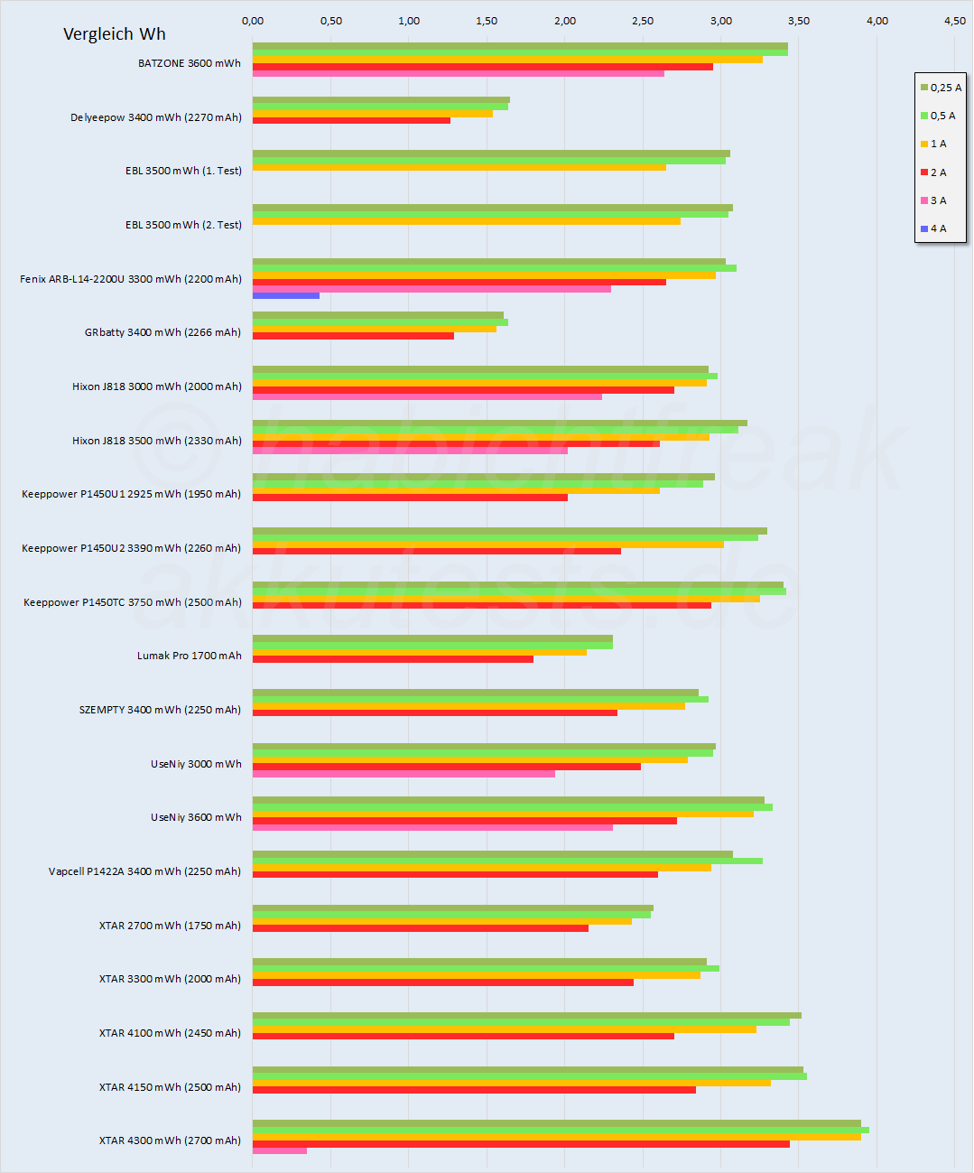 3500mWh sind etwas zu hoch gegriffen. Falls man einen Akku erwischt dessen interne Zelle ca. 950mAh hat, sind 3400mWh durchaus realistisch. Dank guter Effizienz kann den Akkus auch ein Großteil davon entnommen werden. Für Ströme über 1A sind die Akkus aber leider nicht geeignet.