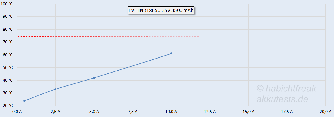 Trotz der nicht ganz erreichten 3500 mAh, bekommt man mit den EVE INR18650-35V viel Energiespeicher für sehr kleines Geld. Für meine 2016 gekauften LG MJ1 (ebenfalls 3500 mAh) habe ich damals einiges mehr bezahlt. Und mit rund 3350 mAh hatten die MJ1 von LG auch keine 3500 mAh. Bei 10A erreichen die Akkus eine Oberflächentemperatur von rund 60°C. Laut EVE sollen die Akkus auch nicht weiter erwärmt werden, für eine lange Lebensdauer sollten die Akkus ohnehin nicht dauerhaft mit 10A belastet werden.