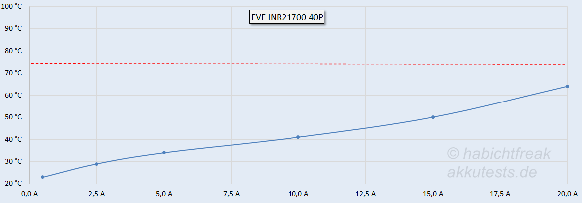 Die EVE INR21700-40P erreichen im Test etwas über 4000 mAh und liefern bis zu 14,9Wh. Dank geringem Innenwiderstand, sind Ströme bis 20A kein Problem. Einen Wert für CDR gibt EVE nicht an, dieser dürfte bei etwa 25A liegen. Bei noch höheren Strömen dürften die Akkus zu heiß werden. Kurzzeitig sind wahrscheinlich auch höhere Ströme möglich. Den Hinweis aus dem Datenblatt, dann die Temperatur der Akkus zu überwachen, sollte man ernst nehmen.