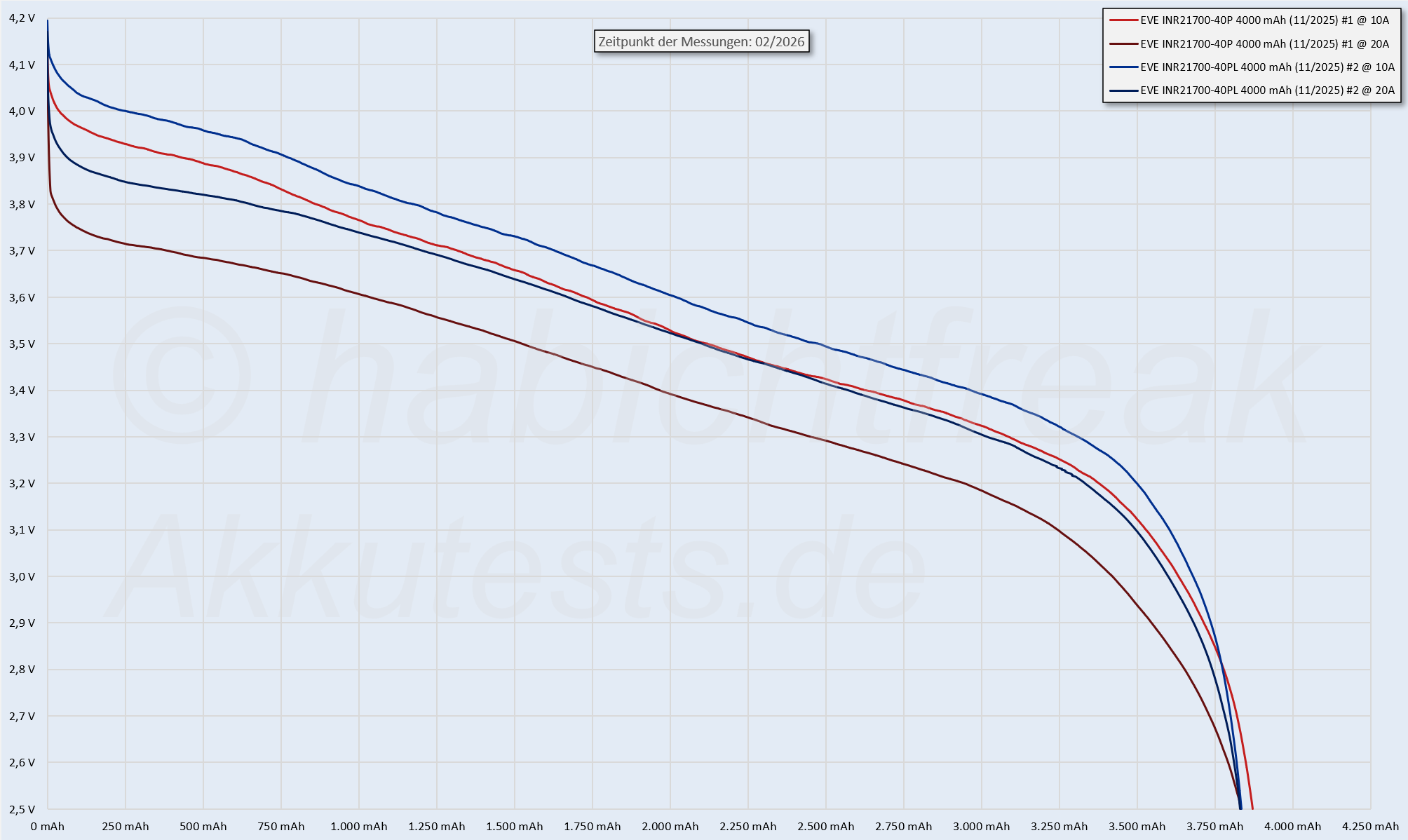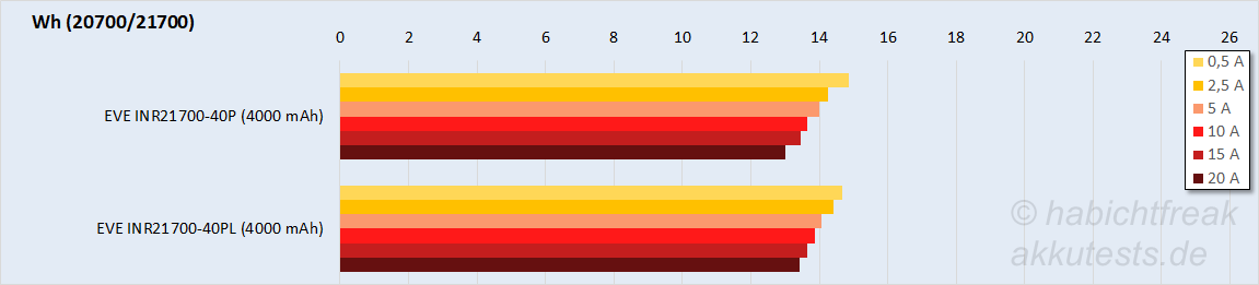 Da die beiden Modelle etwa die gleiche Kapazität erreichen, ist die Energie die die 40PL bei höheren Strömen liefern auch etwas höher. Wenn auch nicht so viel höher wie man im ersten Moment vielleicht denken mag: