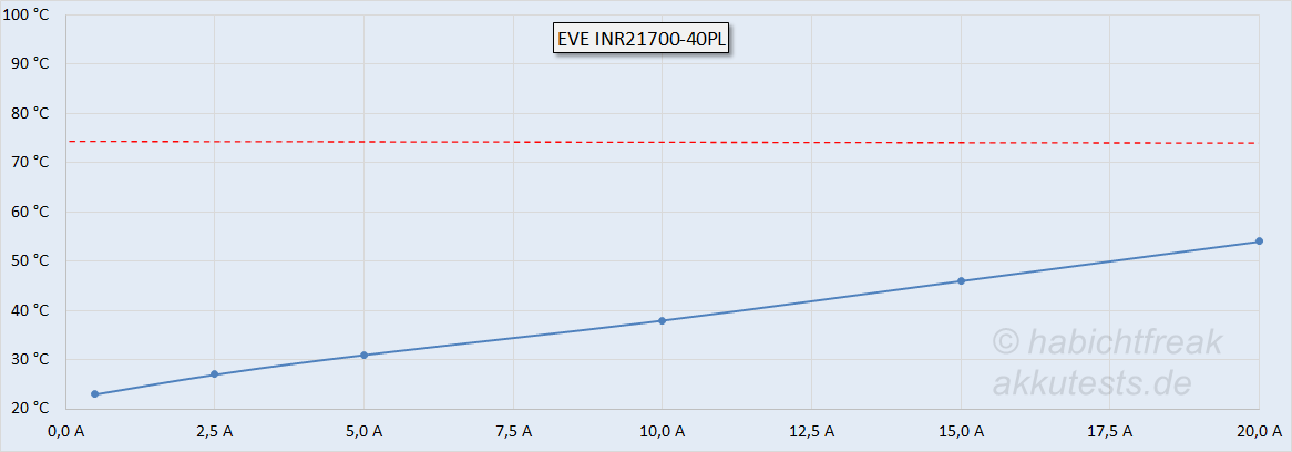0,4 Wh sind es bei 20A. Das sind zwar nur 3% und klingt nach recht wenig, macht aber bei der Temperatur einen sehr großen Unterschied. Während die 40P bei 20A auf maximal 64°C (Oberflächentemperatur bei 22°C Raumtemperatur) kommen, bleiben die 40PL mit maximal 54°C deutlich kühler. Wärme ist eine Form von Energie. Durch den Innenwiderstand der Zelle wird ein Teil der gespeicherten Energie bei hohen Strömen direkt in Wärme umgewandelt. Diese Energie steht dadurch nicht mehr als elektrische Energie zur Verfügung, um einen Verbraucher zu betreiben. Das diese 0,4Wh bei 20A in Abwärme umgewandelt werden, lässt sich übrigens - ganz ohne nachzumessen - auch berechnen: