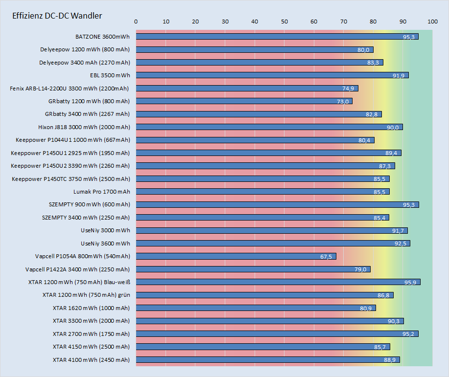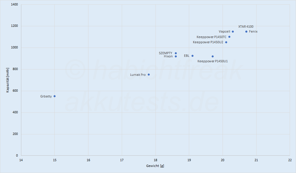 Hätte der Fenix Akku nur eine Zelle mit 931mAh, wäre er zu schwer. Er wiegt aber exakt das Gleiche wie der XTAR 4100mWh. Daher gehe ich davon aus, dass sich im inneren tatsächlich die angegebene Zelle befindet. Was Fenix aber sehr wahrscheinlich gemacht hat: Die typischen Spannungen, 4,2V (Ladeschlussspannung) herabgesetzt und/oder die 2,5V (Endladeschlussspannung) höher eingestellt. Letzteres wird von Herstellern gerne genutzt, da es auch eine Art Tiefentladeschluss darstellt. Da der Fenix Akku aber über die Elektronik einen wirksamen Schutz vor Tiefentladung besitzt, könnte ich mir gut vorstellen, dass Fenix beide Spannung angepasst hat, was die Haltbarkeit der Li-Ionen Zelle deutlich erhöht. Nachteil des ganzen: nicht die volle Kapazität ist nutzbar. Das würde auch das Gewicht erklären, dass auf die angegebene Zelle hindeutet. Der Spannungswandler arbeitet, wenn er nur 931mAh verarbeiten kann, auch nicht mit einem Wirkungsgrad von nur 75%, sondern mit 92,5 %. Mit nur 931mAh, stehen auch nur 3352 mWh zur Verfügung die in 1,5V+1,2V umgewandelt werden können. Das dann auch keine 3300mWh (wie von Fenix angegeben) herauskommen, sondern nur 3100mWh erscheint jetzt auch schlüssig.