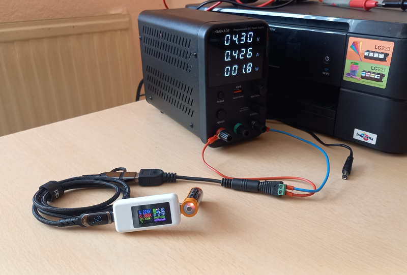 Mir kam die Idee, den Akku mit einem Labornetzteil zu laden. Glücklicherweise fand ich einen DC zu USB-A (Female) Adapter in meiner Grabbelkiste. So konnte ich den Akku über das Labornetzteil laden. Wenn eine Linearladeregler verbaut wäre, ist die Stromaufnahme immer gleich. Denn die Energie (Ladespannung minus Spannung die der Akku zum Laden benötigt mal Stromaufnahme) wird von einem Linearladeregler in Wärme umgewandelt. Ein Schaltladeregler hingegen arbeitet effizienter, weshalb die Stromaufnahme bei höherer Spannung abnimmt: