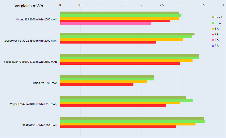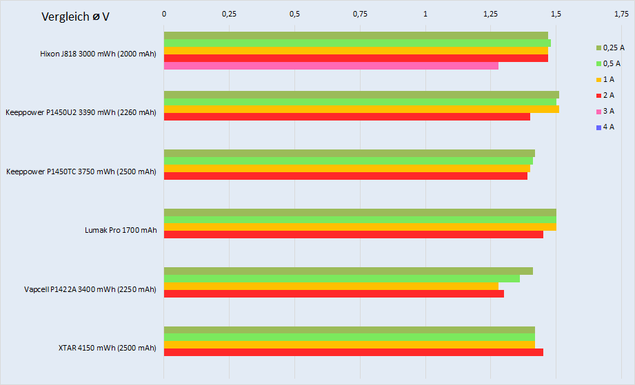Auch wenn die Akkus die 3A bzw. auch schon die 2,5A nicht über die gesamte Messung aufrechterhalten können, hat bisher kein anderer 1,5V Akku den ich getestet habe überhaupt den 3A Durchlauf geschafft. Insofern gehört der Hixon zu den besten Akkus die derzeit überhaupt 3A liefern können. Selbst der Konkurrent aus eigenem Hause, der blau-schwarze Hixon 3500mWh schaffte im Test bei akkuvergleichstest nur 1,35 Wh bei 3A. Das ist nur etwa die Hälfte seines grün-weißen Bruder.