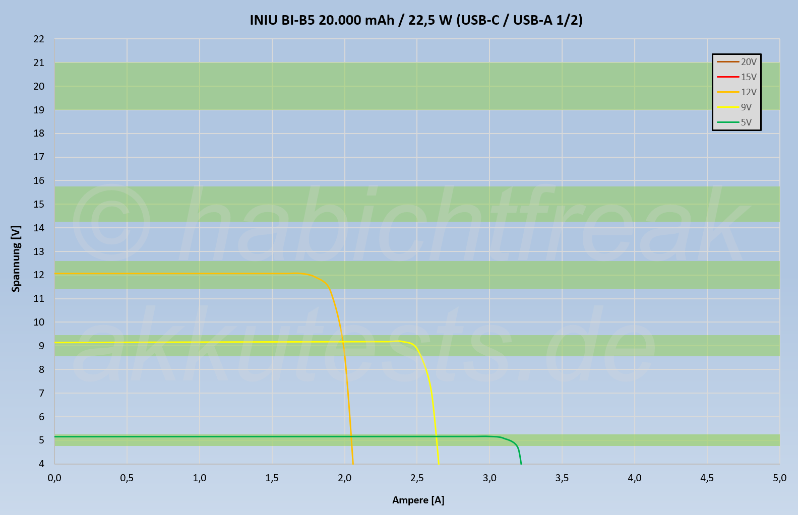 Die einzige Herstellerangabe die ich finden konnte, die ich nicht bestätigen kann, sind die 4,5A die die USB-A Ports bei 5V liefern sollen. Mehr als 3,1A liefern sie bei mir nicht. Möglicherweise wird diese Leistung nur erreicht, wenn man das richtige Schnellladeprotokoll simuliert. Da über 4A bei 5V eine absolute Nischenanwendung sein dürfte, sei der Punkt nur der Vollständigkeit erwähnt. Wirklich kritisch sehe ich die „nur“ erreichten 3,1A nicht. Denn mir ist kein Gerät bekannt, dass heutzutage bei mehr als 15W Ladeleistung zwingend 5V benötigt. 99% aller Geräte am Markt dürften 9 oder 12V unterstützen, so wie auch die BI-B5.