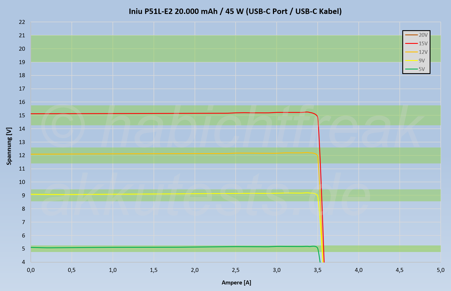 An all meinen Messtationen schaltet sich die Powerbank sehr schnell ab. Sie drosselt die Leistung nicht, sie schaltet ab. Und kurz darauf schaltet sie sich wieder ein, wieder aus, und so weiter. Ich vermute, da die Messstationen keine Schnellladeprotokolle kennen und das Triggerboard auch nicht kommunizieren kann, zumindest nicht mit der Messtation, wird hier keine Drosselung ausgehandelt. Zwar wäre denkbar, dass die Powerbank selbst den fließenden Strom begrenzt und damit die Leistungsabgabe drosselt, so wie es beispielsweise einige 1,5V Akkus bei der 3A Messung machen (45W @ 15V sind zufällig ebenfalls 3A). Aber das ist in INIU`s 18 Layer SmartProtect System nicht vorgesehen. Wobei INIU sicherlich sagen würde: „Ihre Messtation ist leider nicht smart genug“. Auch das ist ein Teil der Wahrheit.