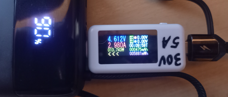 Die Powerbank selbst lädt mit bis zu 27W. Schließen ich mein Telefon an, wird das mit maximal 12W geladen (begrenzt durch das Telefon, nicht durch die Powerbank). Wie sieht es aber aus, wenn beides gleichzeitig angeschlossen ist?