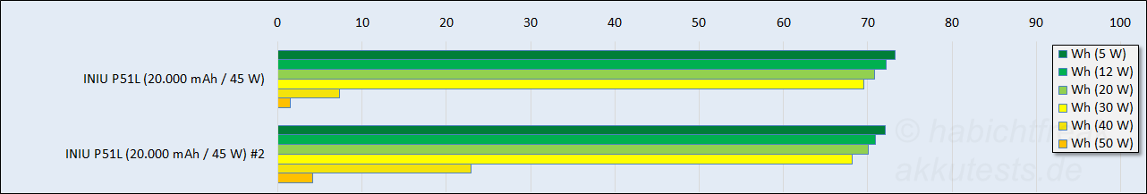 Bei höherer Belastung, liefert die 22,5W Variante aber zunehmend weniger Energie. Beim Entladen mit 12W sind es bereits 7% weniger Energie. Die 45W Variante liefern nur 1,5% weniger Energie. Bei 20W sind es bei der 22,5W Variante bereits 12,2% weniger Energie, bei der 45W Variante nur 3,4%. Dieser Vorteil dürfte durch effizientere Bauteile in der Elektronik erreicht werden. Aber auch Akkuzellen die bei höherer Entladung mehr Energie liefern, können hierfür verantwortlich sein.