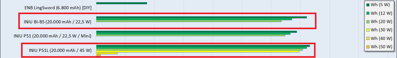 INIU bewirbt die 45W die dieses Modell bietet, sehr stark. Kein Wunder, bietet das ansonsten sehr ähnliche Modell von INIU BI-B5 mit ebenfalls 20.000 mAh nur 22,5W. Irgendwie muss man die 30% Preisaufschlag auch rechtfertigen. Die Energie die beide Modelle speichern können, ist identisch. Die 45W-Variante bietet nur eine höhere Spannung (15V) und eben eine höhere Ausgangsleistung. Aber bereits der Dauertest mit 40W endete nach 11 Minuten. Zu diesem Zeitpunkt war noch 90% der Energie in der Powerbank. Nur 10% konnte sie bei 40W abgeben, bevor sie abgeschaltet hat.