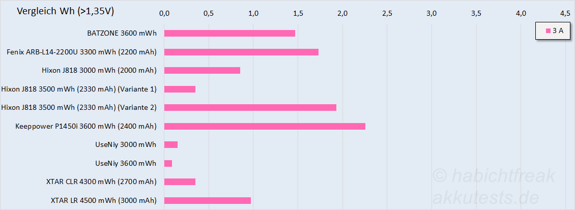 Den Begriff der Referenzkapazität findet man eher im SAP Bereich, dort hat er mit Akkus nichts zu tun. Es gibt diesen Betriff zwar auch im Zusammenhang mit Akkus, dabei wird die Kapazität des Akkus in einem Referenzladegerät bestimmt. Rated Capacity/Energy bezeichnet das Minimum an Kapazität (oder Energie) die einem Akku unter definierten Bedingungen garantiert entnommen werden können (siehe Norm IEC 61960-3 bzw. DIN EN 61960-3:2017-12). Die Bedingungen für diesen Test stehen ebenfalls in der Norm: 0,2C (Entladestrom) und 20°C. Aus den Datenblättern der drei neuen Modelle geht hervor, dass die jeweils aufgedruckten mWh die der internen Zellen sind, nicht die des 1,5V Akkus. Damit diese mWh mindestens (!) auch entnommen werden können, müsste der Wirkungsgrad 100% oder darüber liegen. Und das ist das Problem, denn 100% Wirkungsgrad werden die Akkus mit an Sicherheit grenzender Wahrscheinlichkeit nicht haben. Es gibt zwar 1,5V Akkus deren Wirkungsgrad sehr gut ist, aber 100% sind in der Praxis unmöglich.