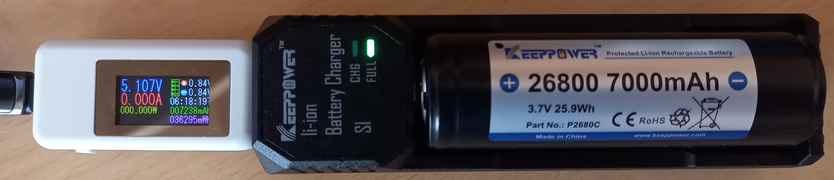 Für diejenigen die sich jetzt fragen warum das bei Keeppower S1 (und auch einigen anderen Modellen) funktioniert, vereinfacht gesagt: Dem Ladegerät werden rund 10W (5V, 2A) zugeführt. Das Ladegerät macht nicht anderes als die 2A an den Akku weiterzuleiten und die Spannung auf 4,2V zu begrenzen. Rund 0,8V*2A (1,6W) werden in Wärme umgewandelt. Das merkt man auch, es wird ziemlich warm. Das wars. Mehr macht es nicht. Es hat keinen Eigenverbrauch, bzw. ist der unter 1mW und damit zu vernachlässigen. Das ist der simpelste und kostengünstige Aufbau eines Ladegerätes. Nicht sehr effizient, aber dafür bietet es den Vorteil, sehr einfach die Kapazität durch eine vollständige Ladung zu ermitteln. Oder um eine Gegenprobe zu machen.