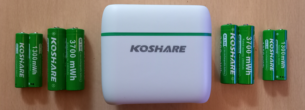 Bei meiner Suche nach neuen 1,5V Akkus die mal genauer unter die Lupe nehmen sollte, bin ich auf KOSHARE gestoßen. Die Akkus sind seit Mai 2025 bei Amazon gelistet. Es gibt nur zwei verschiedene Sets. 8xAA mit Ladebox oder 4xAA + 4xAAA mit Ladebox. In einem schweizer Shop findet man auch 9V Akkus mit diesem Namen. Hierzulande gibt es nur AAA/AA bei Amazon. Ich habe mir das Set aus 4xAA (3700mWh/2460mAh) und 4xAAA (1300mWh/860mAh) bestellt um die Akkus zu testen. Dieses Review beleuchtet ausschließlich die AA Akkus, für die AAA Akkus gibt es separates Review.