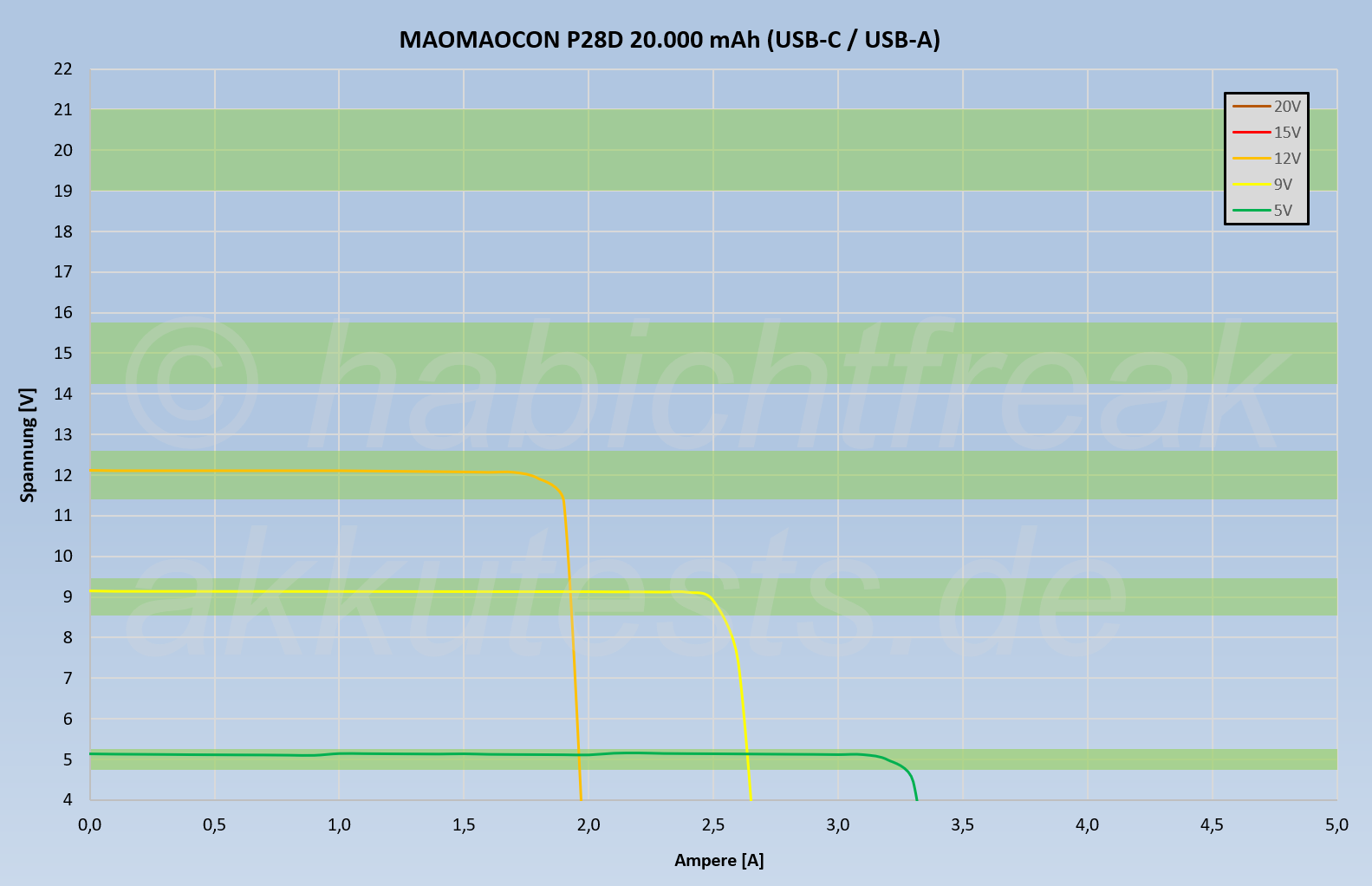 Die Powerbank liefert die Ströme die sie liefern soll und die Spannungen liegen im erlaubten Rahmen. Was nicht mehr im erlaubten Rahmen liegt ist die Energie die die Powerbank angeblich speichern kann (74 Wh). Von diesem Wert ist der interne Akku leider meilenweit entfernt. Wenn nur 39,7 Wh für eine vollständige Aufladung hineinfließen, kann der Akku niemals 74 Wh speichern. Denn mindestens diese Menge an Energie müsste auch hineingeladen werden. Statt einer 20.000 mAh Powerbank, wird hier eine 10.000 mAh (36 bzw. 37 Wh) Powerbank geliefert. Ob es nur 10.000 oder 10.400 mAh sind, und ob man mit 3,6 oder 3,7V rechnet ist unwichtig. Maximal 34,3 Wh kommen heraus, 39,7 Wh fließen rein. Also liegt die Energie die diese Powerbank speichern kann zwischen diesen beiden Werten. 36/37 Wh erscheint hier ein realistischer Wert zu sein, was häufig als 10.000 mAh Powerbank vermarktet wird. Damit bekommt der Käufer dieser Powerbank gerade einmal 50% des Energiespeichers, der beworben und bezahlt wurde.