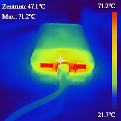 Unter Volllast bleibt die Powerbank von außen recht kühl. Im Inneren scheint es im Bereich der Anschlüsse allerdings schon sehr warm zu werden. Dennoch wird die Leistung nicht gedrosselt.