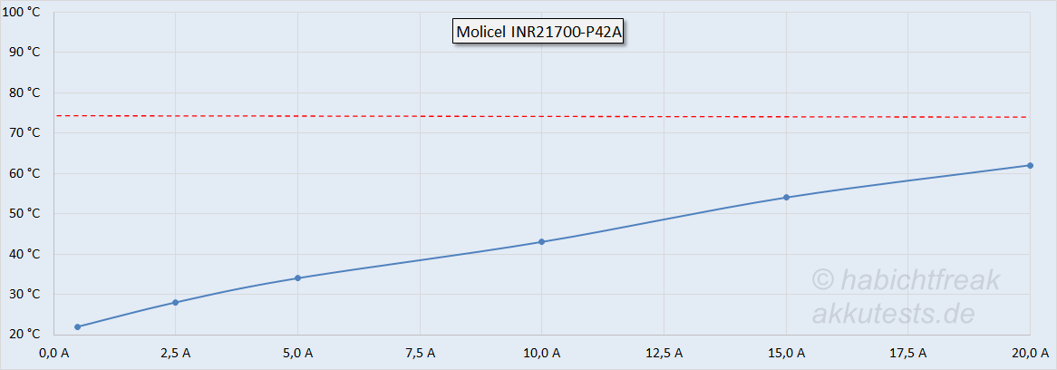 Allgemeiner Hinweis zu Temperaturen von High-Drain Akkus: Die meisten Modelle haben heutzutage keine CDR mehr (die Stromstärke, bei der die Temperaturen unbedenklich sind). Meistens wird in Datenblättern nur noch ein „Maximum Discharge“ angegeben, und fast immer mit einem Temperaturlimit. Die hier gezeigten Temperaturen sind die bei einem offenen Messaufbau. In Akkuträgern, im Rohr der Taschenlampe oder in einem Akkupack sind die Temperaturen deutlich höher. Ohne Temperaturüberwachung solltest du diese Akku nie dauerhaft mit sehr hohen Strömen belasten.