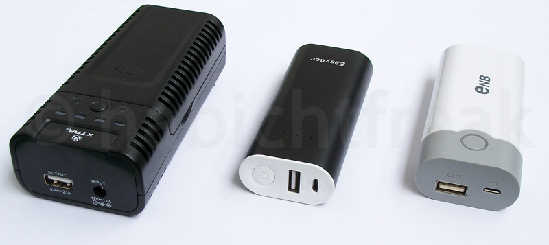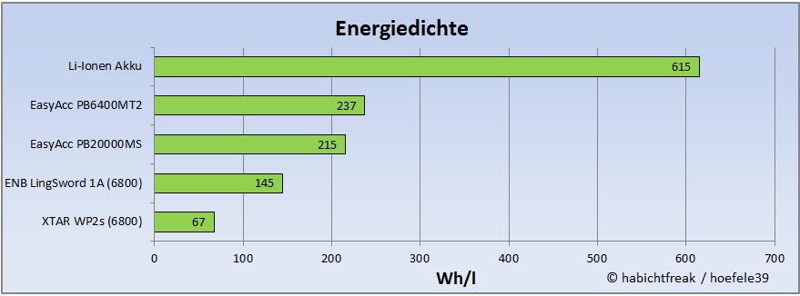 Auch wenn die getesten Modelle teilweise sehr unterschiedlich sind, möchte ich sie in Bezug auf zwei Faktoren vergleichen. Zum einen die Energiedichte. Jede Powerbank ermöglicht die Abgabe einer bestimmten Energiemenge. Setzt man diesen Wert in Relation zur Größe (Volumen), ergibt sich die Energiedichte. Als Bezugswert dient ein einzelner Li-Ionen Akku. Dessen Wert kann von einer Powerbank zwar nicht erreicht werden, da Gehäuse, Anschlüsse und Elektronik auch Platz brauchen, aber je besser eine Powerbank ist, je näher kann sie diesem Ergebnis kommen.