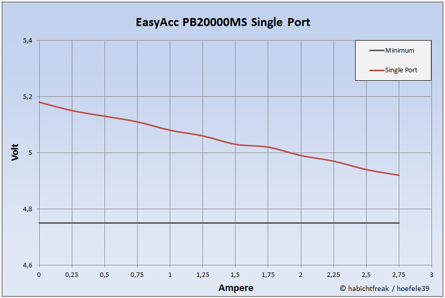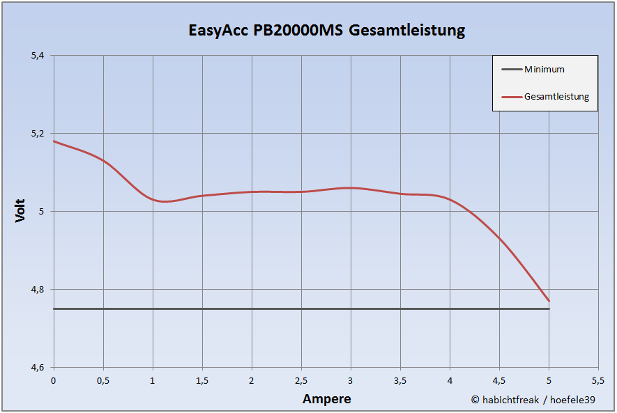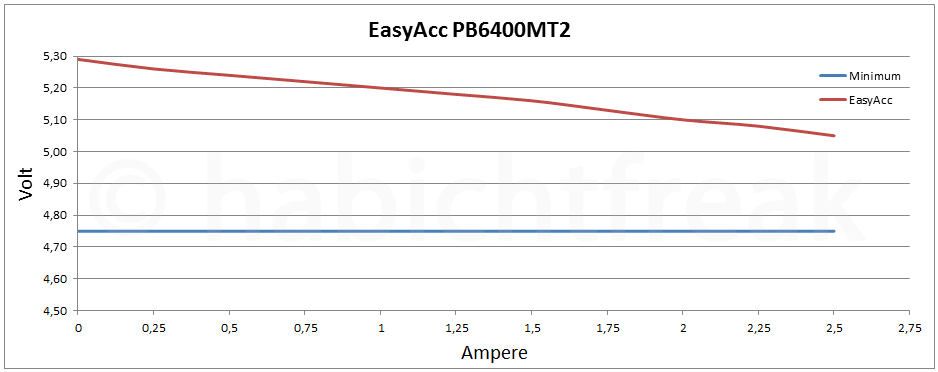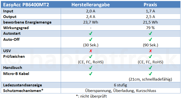Die PB6400MT2 hält was sie verspricht. Die Ausgangsleistung wird nicht nur erreicht, sondern übertroffen. Das macht sie auch für größere Verbraucher wie Tablets interessant. Der Gesamtwirkungsgrad von 79% lässt auf hochwertige und gut abgestimmte Bauteile schließen. Positiv erwähnen möchte ich an dieser Stelle, dass EasyAcc als einer der wenigen Anbieter nicht nur mit der werbewirksamen Ladung (mAh) wirbt, sondern fairerweise auch dazu schreibt, welche Energiemenge sich daraus ergibt und das sich diese Werte auf die verbauten Akkus bei 3,7 Volt bezieht. Denjenigen, die in Physik immer Kreide holen waren hilft das zwar auch nicht weiter, für alle anderen ist es aber durchaus nützlich.