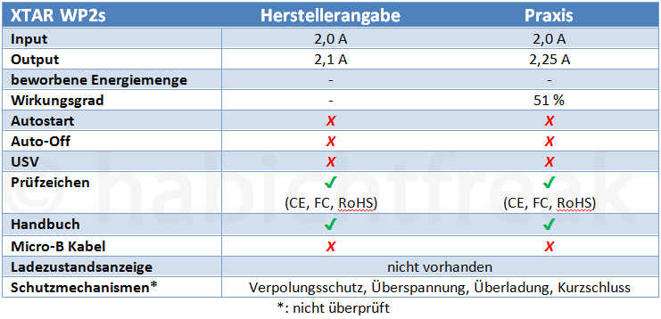 Das XTAR vereint Licht und Schatten. Auf der Habenseite sind der hohe In- und Output, die Unterstützung für Li-Ion Akkus fast aller Größen und einen soliden Ladegerät. Vermissen lässt es typische Funktionen wie das automatische Einschalten beim Einstecken eines Verbrauchers oder das automatische Abschalten. Auch der Wirkungsgrad ist unerwartet niedrig. Zudem ist das Gerät deutlich größer als andere (bei gleicher Ladung).