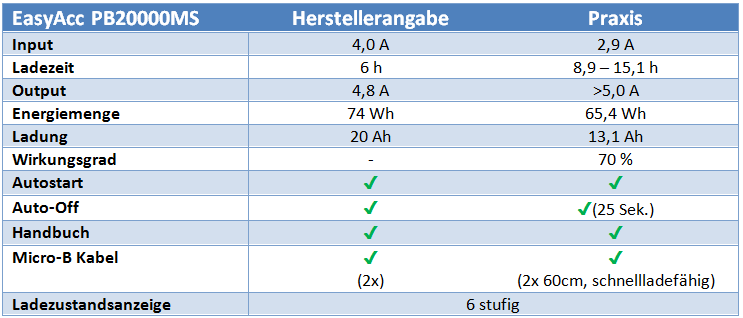 Im Großen und Ganzen überzeugt die Powerbank. Einzig die Ladezeit wird nicht erreicht (9 statt 6 Stunden). Aber auch 9 Stunden sind ein guter Wert. Nach Rücksprache mit dem Hersteller stellte sich heraus, dass die 4A, die zum Erreichen der 6 Stunden notwendig gewesen wären, nie vom Hersteller getestet wurden. Man nahm an, dass sie es schaffen würde. Das formuliert die Marketing-Abteilung leider ganz anders. Immerhin, man versprach Besserung.