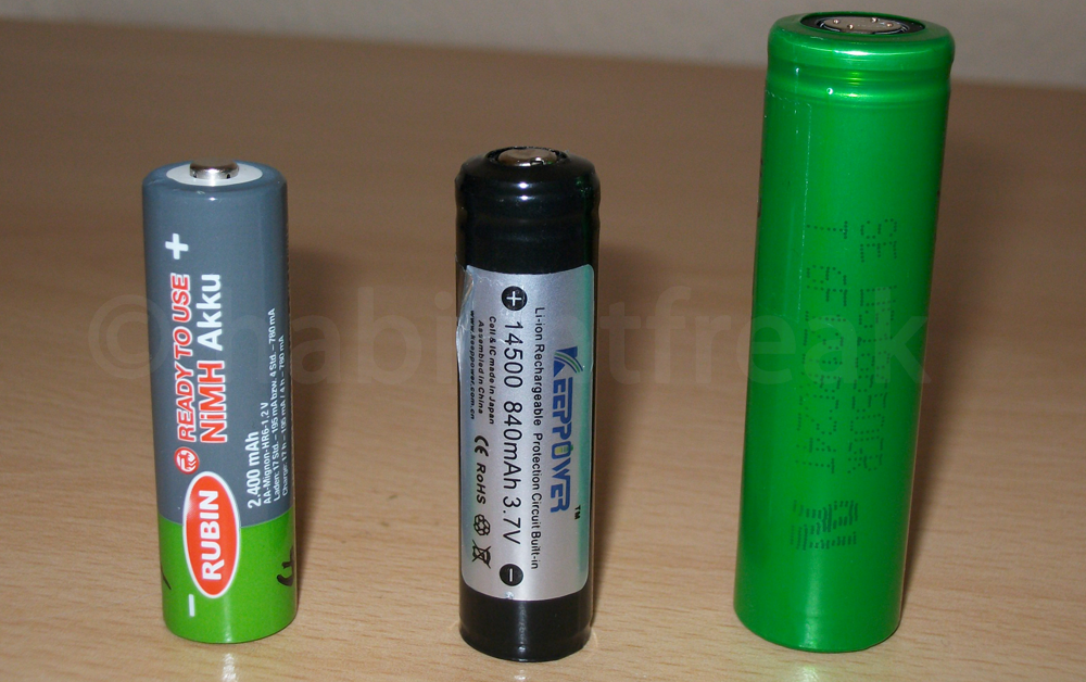 Die kleineren Zellen (wie 14500) haben im Verhältnis zu NiMH Akkus keine höhere Energiedichte. Je größer die Zellen „gewickelt“ werden, je besser wird die Energiedichte. 18650er Zellen sind zwar nicht die mit dem größten Volumen, aber seit ca. 15 Jahren eine gängige Baugröße und daher die Zelle, die primär weiterentwickelt wird. Bevor Notebooks ultraflach werden mussten, steckten 4-9 Zellen dieses Typs im Akku des Notebooks und auch heute werden 6.000 bis 8.000 einzelne Zellen im Tesla (ein Elektroauto) verbaut. Und in vielen Powerbanks stecken diese Zellen auch. Die derzeit höchste kaufbare Kapazität beträgt 3.500mAh (Stand 2015). Das entspricht einer Energiedichte von rund 760 Wattstunden pro Liter (Wh/l). Zum Vergleich, NiMH Akkus kommen auf etwa 350 Wh/l.
