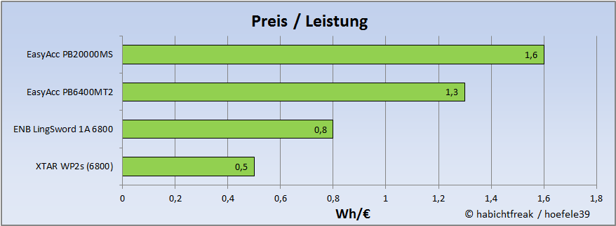 Der zweite Vergleich betrifft das Preis-Leistungsverhältnis. Hierzu sei jedoch gesagt, dass nur die Energiemenge als Leistungsfaktor herangezogen wird. Gerechnet wurde mit dem Preis der Powerbank zum Zeitpunkt des Kaufes, bzw. dem Preis für das jeweilige Gehäuse plus dem Preis für die Akkus.