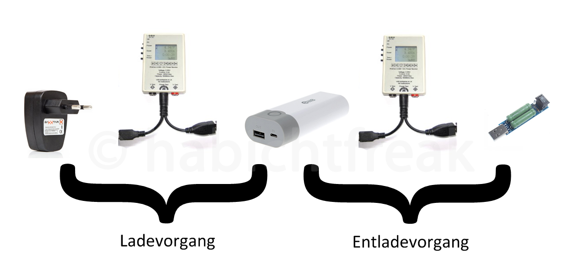 Als Messgerät dient das „Portapow Premium USB + DC Power Monitor“. Jede Powerbank wird mit zwei unterschiedlichen Netzteilen geladen. Zum einen das PSM03E von OneTouch. Es liefert laut Aufdruck bis zu 550 mA, in der Praxis erreicht es i.d.R. 650 mA. Das zweite Netzteil ist von Baxxtar und liefert 2000 mA. Diese Messung dient zur Überprüfung, ob die Powerbank, wie meist beworben, tatsächlich eine Schnellladefähigkeit besitzt. Entladen wird jede Powerbank mit einem 5 Ohm Lastwiderstand. Je nach Ausgangsspannung fließt so etwa 1 Ampere.
