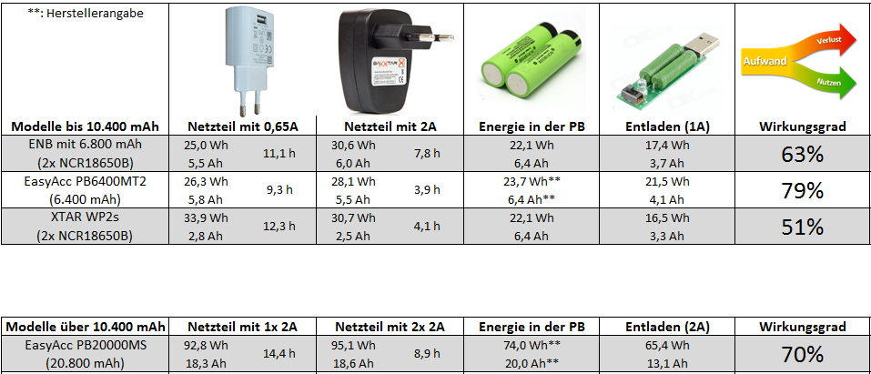 Während des oben beschriebenen Versuchsaufbaus entstehen 3 Energieumwandlungen. Die Erste ist das Laden der Akkus, die Zweite der Unterschied zwischen zugeführter Ladung und entnommener Ladung der Akkus (bei Li-Ion annähernd 100%), und die Dritte die Transformation der Zellspannung auf die benötigten 5 Volt am USB Ausgang. Je hochwertiger die Bauteile und je abgestimmter die Elektronik auf die verbauten Akkus ist, je höher ist der Gesamtwirkungsgrad.