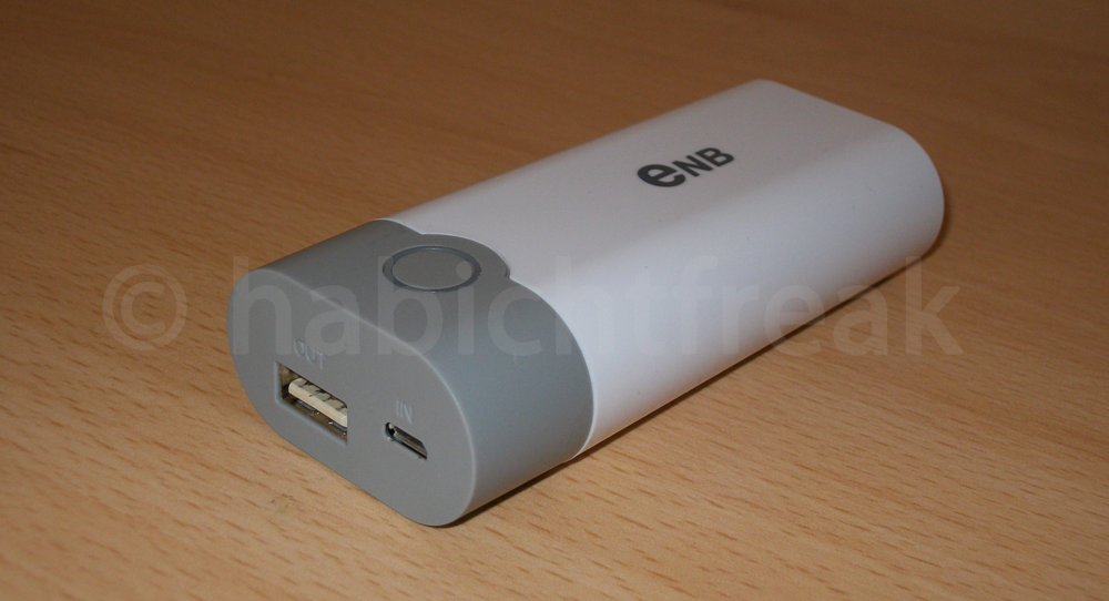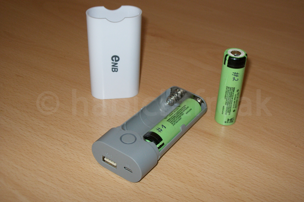 Bestückt wird die Powerbank mit 2 Akkus von Panasonic (NCR18650B). Diese besitzen laut Hersteller 2x 3.400 mAh. Da sie bereits einige Zyklen hinter sich haben, beträgt die Ladung nur noch 6.400 mAh (3.300 und 3.100). ENB gibt die Leistung mit 1A für In- und Output an. Der Wirkungsgrad wird mit 85% ausgewiesen. Ein optisch baugleiches Modell namens „LingSword AA“ bietet 1A (Input) und 2A (Output) und soll einen Wirkungsgrad von 93% erreichen. Zum Lieferumfang gehört ein Micro-B Kabel (42cm) ohne Datenleitungen und ein Handbuch (englisch, chinesisch).