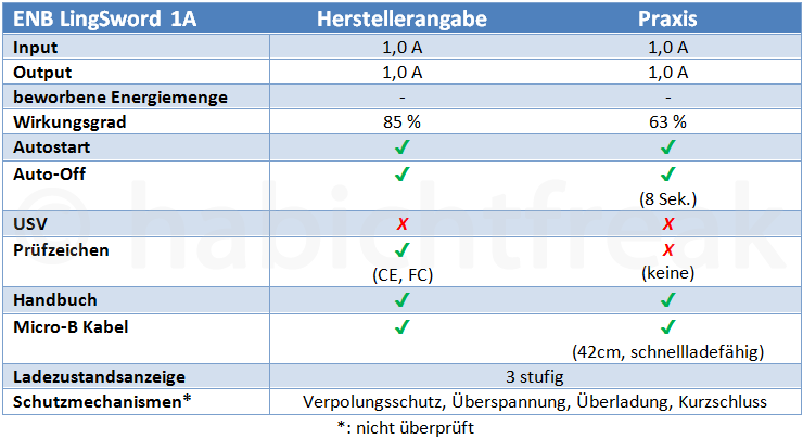 Die LingSword 1A hält was sie verspricht. Sie setzt keine neuen Maßstäbe, enttäuscht aber auch nicht. Für rund 6 Euro können so zwei alte Akkus einen neuen Verwendungszweck zugeführt werden. Das Fehlen der Prüfzeichen stört mich nicht, wenn aber der Zoll es sieht (da nur im Ausland erhältlich), darf der Artikel nicht in die EU eingeführt werden. Der Wirkungsgrad ist von der Herstellerangabe ein ganzes Stück entfernt. Vermutlich bezieht ihn der Hersteller nur auf den Trafo (Umwandlung von Zellspannung auf 5 Volt). 63% ist angesichts des Preises ganz akzeptabel.