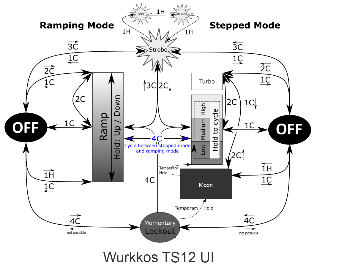 Die mitgelieferte Beschreibung (Faltzettel) ist in den Sprachen Englisch, Deutsch und einer weiteren - mir unbekannten - Sprache verfasst. Der deutsche Text ist in hervorragendem deutsch verfasst und beschreibt die meisten Funktionen. Wünschenswert wäre eine graphische Darstellung, da zwar die meisten Funktionen von anderen Lampen mit Andruil bekannt sein dürften, jedoch vereinzelt Änderungen durch Wurkkos vorgenommen wurden. So aktiviert man den Lockout zwar mit 4C, deaktiviert ihn aber nicht mit 4C, sondern mit „mehr als 2 Klicks“. So zumindest steht es im Faltzettel. Mehr als zwei sind für mich 3C und mehr. Mit 3C wird der Lockout jedoch nicht deaktiviert, sondern nur bei 4C. Hierbei kehrt man sofort zur gespeicherten Stufe zurück. Ein deaktivieren des Lockout ohne die Lampe dabei einzuschalten, existiert nicht.