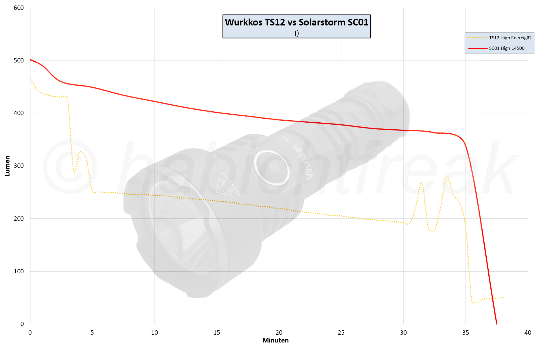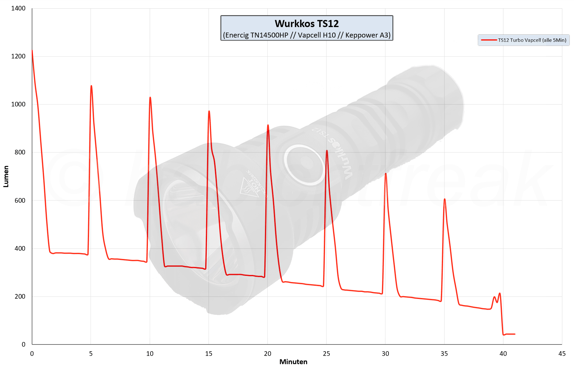 Ich habe mir mittlerweile einige Laufzeitdiagramme anderer Reviews zu Wurkkos Lampen angesehen. Das der Turbo immer nach sehr kurzer Zeit vorbei ist, scheint bei einigen Lampen dieses Herstellers so zu sein. Vielleicht sogar bei den meisten. Dass das nicht so sein muss, auch nicht in dieser Baugröße, stellen andere Modelle, ähnlicher Preisklasse unter Beweis. Aus der Sicht betrachtet enttäuscht die TS12 für mich, in Punkto Leistung.