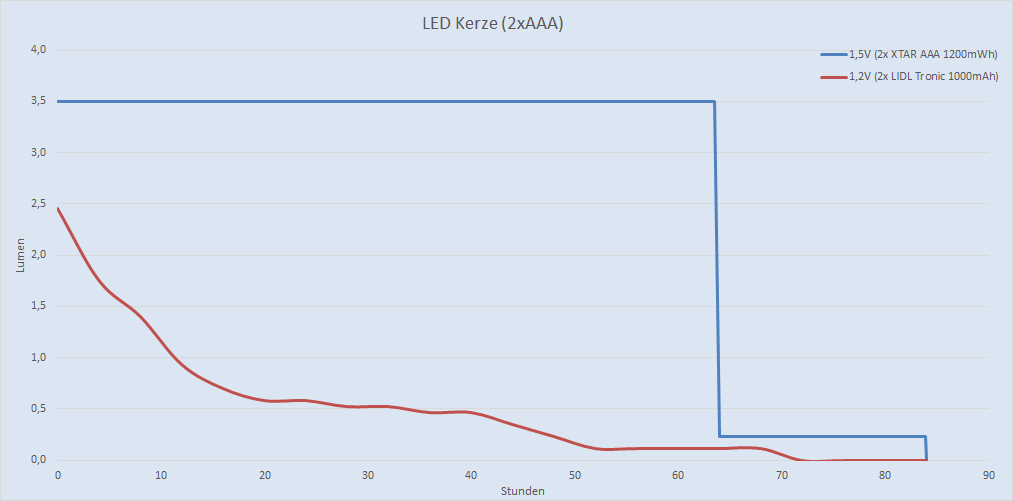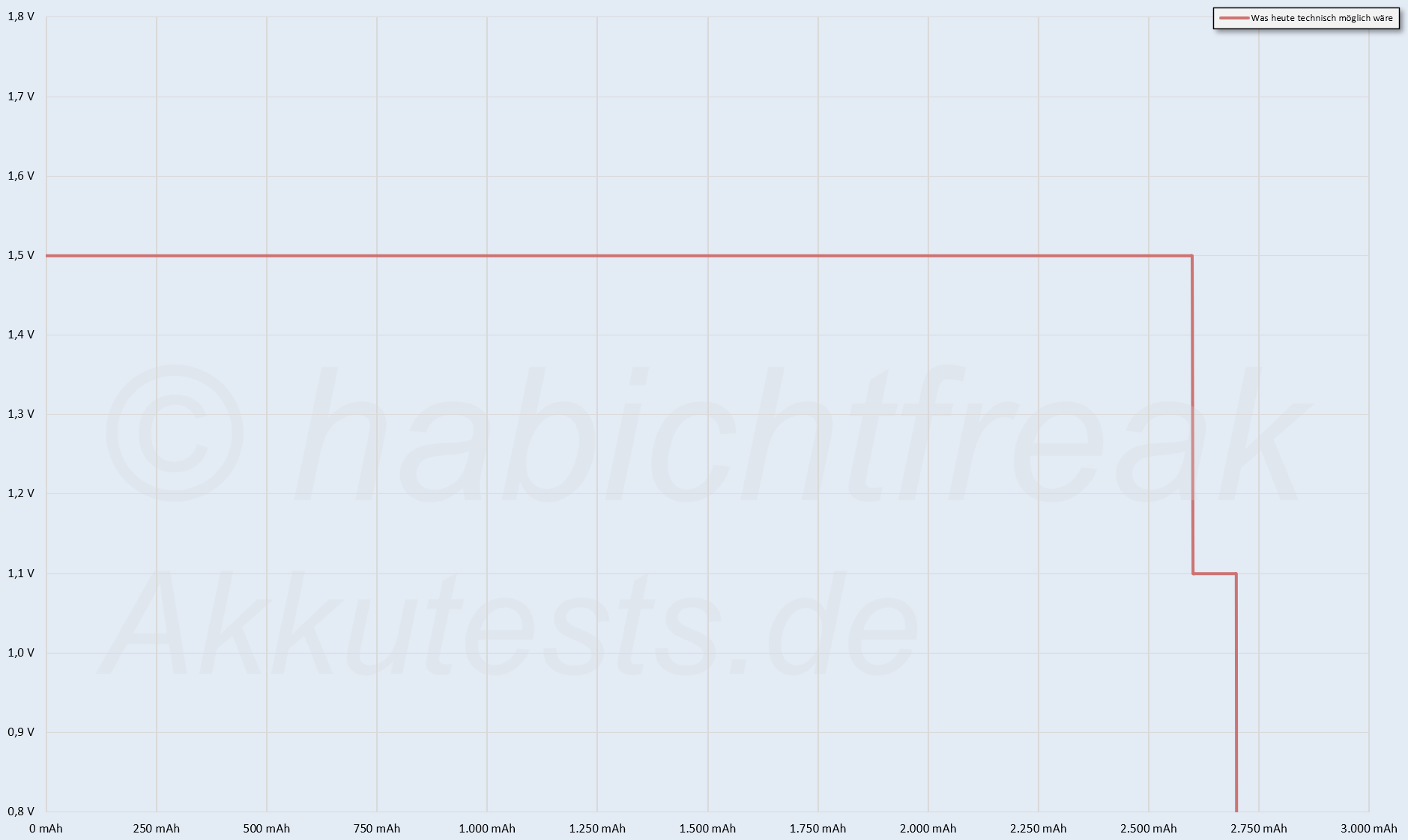 Dieser Akku würde 2600mAh bei durchgehend 1,5V erreichen + 100mAh bei 1,1V. Dieser Akku könnte 4000mWh abgeben und wäre mit weitem Abstand der beste 1,5V Akku am Markt. XTAR hat die Zelle, XTAR hat die Technik, XTAR hat das Know-How. Sie müssten es nur in einem Produkt vereinen …