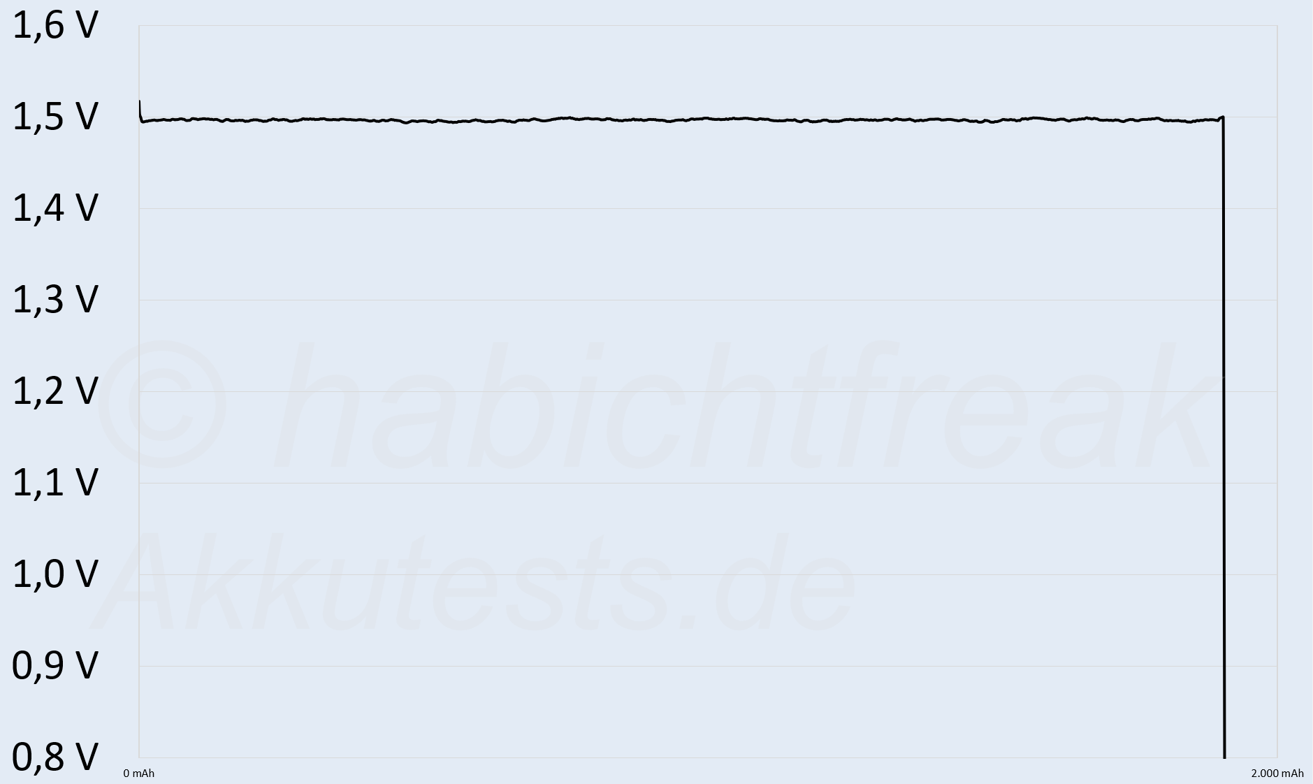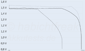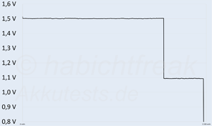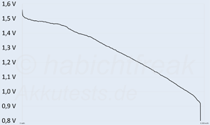 Den Spannungsverlauf den man bei einem „CLR“ Modell erwarten würde, haben diese Akkus nicht. Dennoch ist der tatsächliche Spannungsverlauf für manche Geräte sogar besser geeignet als ein CLR Akku. Die interne Zelle ist 9% zu klein. Oder liefert nur zu wenig Energie, weshalb die Leistung ein gutes Stück hinter den Erwartungen bleibt. Am wirksamen Schutz vor Tiefentladung wurde nicht gespart. Den haben die Akkus.