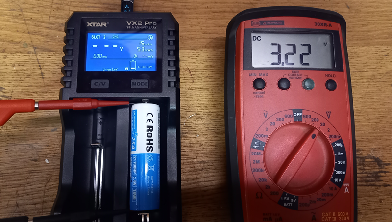 Die Messungen mit 0,5A waren beendet, also Akkus in das VX2 Pro. Dies erkannte die Akkus als 1,5V Akkus und fing - laut Anzeige - diese an mit 600mA zu laden. Es dauerte ein paar Sekunden bis es auch bei mir Klick machte. 1,5V Akkus werden mit um die 5V geladen. Beim Fenix ARB-L14-2200U hatte ich es vor einiger Zeit mal getestet wann die Schutzschaltung zurückgesetzt wird und wieder geladen werden kann. Im damaligen Test war das bei um die 4,2V. Falls das VX2 Pro auch gerade versucht einen 1,5V Akku zu laden, müsste es es das mit einer Spannung irgendwo zwischen 4,2 bis 5,5V machen. Das wäre für den 3,6V Akku aber zu viel. Da ich nicht weiß wie XTAR die Erkennungslogik gestaltet hat, nahm ich den Akku erst einmal aus dem Ladegerät. Er war ca. eine Minute im VX2 Pro und hatte noch immer "0V". Falls er wirklich eine Überspannung bekommen haben sollte, hat die Schutzschaltung im Akku gleich wieder ausgelöst. Für weitere Untersuchungen bin ich dann sicherheitshalber nach draußen gegangen.