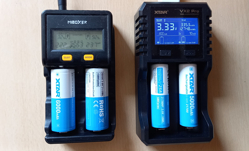 Bisher verwende ich im Alltag für NiMH, insbesondere für die Refresh Funktion das technoline BC700. Dieses Ladegerät hat seit nunmehr über 10 Jahre alle NiMH Akkus meines Haushalts geladen. Seit 2025 verwende ich auch das XTAR L8 gerne, da es sowohl für NiMH als auch 1,5V Akkus geeignet ist und trotz kleiner Abmaße bis zu 8 Akkus unabhängig laden kann. Vom XTAR L8 habe ich mittlerweile sogar mehrere Exemplare im Haushalt. Insbesondere in der kalten Jahreszeit gibt es viele Akkus regelmäßig zu laden. Für Li-Ionen Akkus verwende ich seit vielen Jahren das Miboxer C2-4000. Es unterstützt auch unterschiedliche Zellchemien, aber ich verwende es nur für Li-Ionen Akkus. Da ich alle Akkus, egal welchen Typs vor jedem Test drei vollständige Zyklen absolvieren lasse, nutze ich die C-D-C Funktion sehr gerne. Das Ladegerät von Miboxer kann pro Schacht mit bis zu 1,5A laden und mit der gleichen Stromstärke auch entladen. Die aktive Kühlung ist daher notwendig, leider auch sehr laut. 21700er ohne PCB passen noch in das C2-4000, geschützte 21700er hingegen nicht mehr. Dafür nutze ich seit 2025 das XTAR VX4 und für noch längere Akkus (geschützte 26800er) das Keeppower S1.